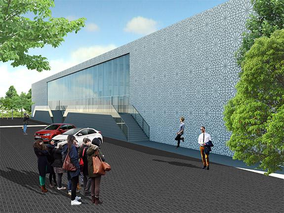 Along the river Schie a new and vibrant extension of the city of Schiedam appears. Part of these developments is a site for events like celebrations, congresses, fairs and exhibitions. The building consists of a collection of functional boxes linked by a highly efficient service zone. The logistical logic makes this building into an. This machine is clad by a veil of perforated steel which allows for the multicoloured light to shine through. Thus, at daytime the architecture of the building merges like a chameleon with the industrial surroundings, at night it transforms into lantern.